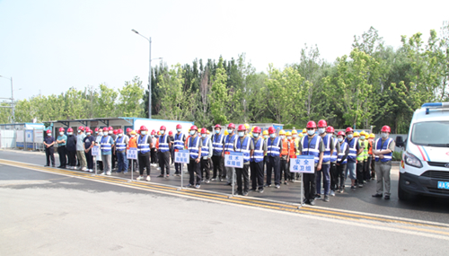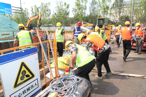 本次演練以因強(qiáng)降雨造成滹沱河和太平河洪水爆發(fā),即將對項(xiàng)目部造成威脅為背景,模擬項(xiàng)目部員工發(fā)現(xiàn)險(xiǎn)情后,立刻向項(xiàng)目部防汛值班領(lǐng)導(dǎo)報(bào)告,值班領(lǐng)導(dǎo)向指揮長進(jìn)行報(bào)告,指揮長下令立刻啟動應(yīng)急預(yù)案,各應(yīng)急小組迅速進(jìn)入應(yīng)急備戰(zhàn)狀態(tài),配備防汛機(jī)具,迅速奔赴現(xiàn)場搶險(xiǎn),設(shè)置警示標(biāo)志和安全警戒區(qū)域,組織人員疏散,搶救重要物資,加固土坡,裝運(yùn)沙袋,同時組織修復(fù)道路,恢復(fù)交通,保證撤離路線暢通,進(jìn)行搶險(xiǎn)救援全過程。